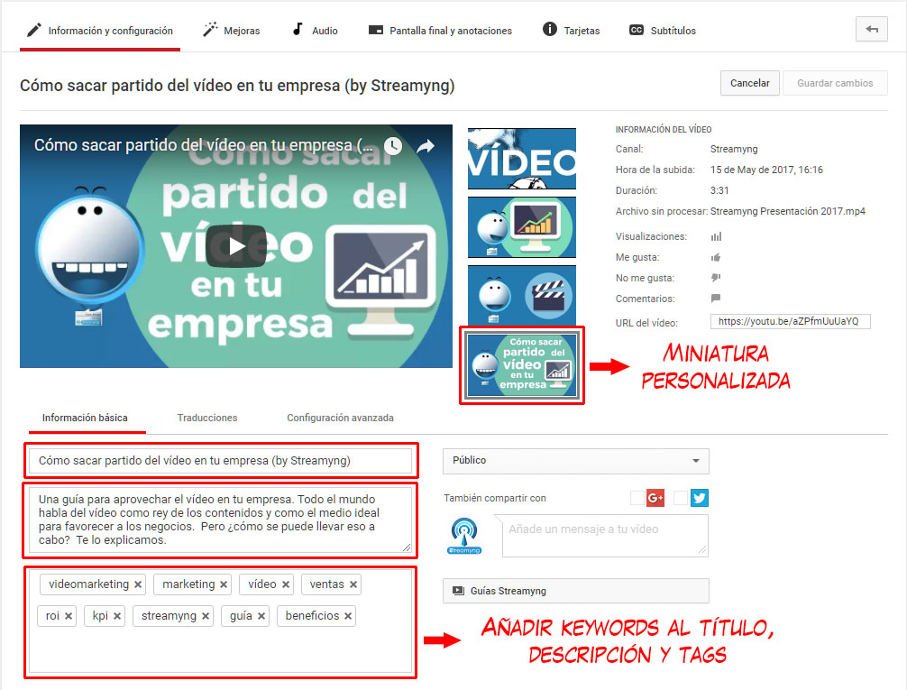 A la hora de dar los últimos toques a nuestro vídeo hemos de tener siempre el SEO en mente igual que hacemos con un artículo de un blog. Así que nos fijaremos en estos apartados clave donde haremos más incisión a la hora de colocar nuestras keywords.